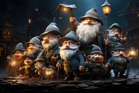 A magical group of cartoon gnomes carries a bright torch, spreading light and joy around. Their sweet smiles and playful appearances add a fairy-tale atmosphere to any place.