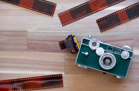 The American Film Camera Argus c3 with Kodak film and film sheet on Wooden Background