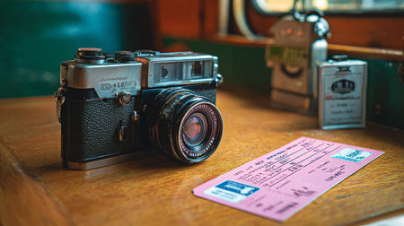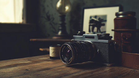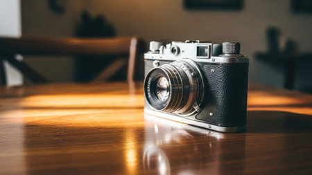 A nostalgic composition featuring a vintage camera arranged on a rustic wooden table, illuminated by soft natural lighting.