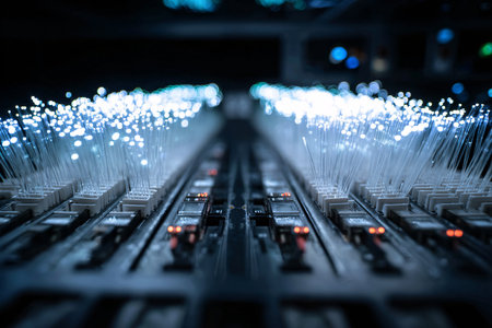Closeup of network cables plugged into data center equipment glowing with vibrant lights technology concept