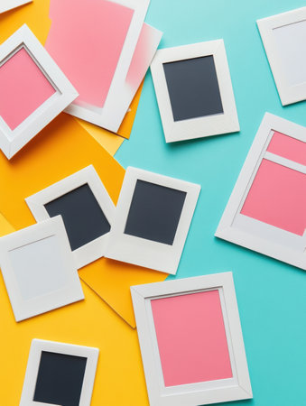 Colorful flat surface features scattered white Polaroid frames with central blank spaces, inviting creativity for memories and personal touch in design.