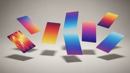 Scattered white Polaroid frames on a vibrant flat surface create an engaging space for personal memories and artistic expression amid colorful backdrops.