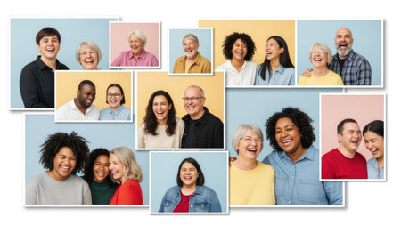 A collage presents multiple individuals of diverse backgrounds. They are smiling and laughing. The portraits use soft lighting. The composition features a variety of skin tones and ages. This image may be suitable for use in advertising, editorial content, or promotional materials that celebrate inclusivity.