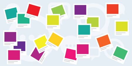 Colorful flat surface features scattered white polaroid frames, offering central empty space for custom designs or personal notes while showing creativity.