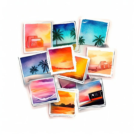 Watercolor stack of instant photos with summer theme. Illustration Generative AI