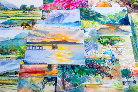 Painting watercolor landscape original colorful of the memories art work by a photography including and emotion in background.