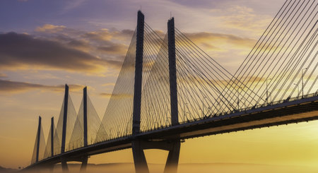 Modern cable stayed bridge with multiple pylons and intricate cables, silhouetted against a vibrant golden and purple sunrise sky with a layer of fog below.