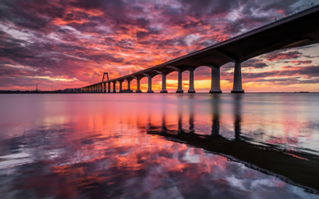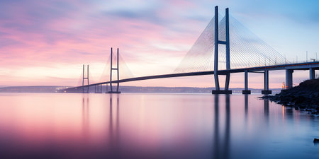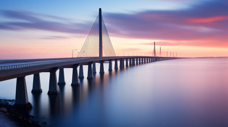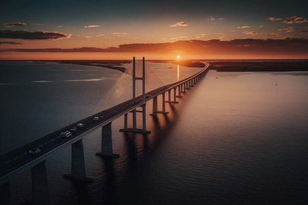 Beautiful long bridge over river sunset view picture AI Generated Image