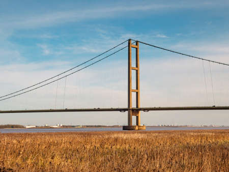 A tower and section of the Humber Bridge seen across a reed bed in North Lincolnshire, England