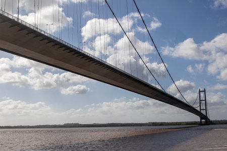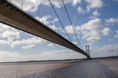 Wide photo of The Humber Bridge, near upon Hull, East Riding of Yorkshire, England, single-span road suspension bridge, taken on a sunny day with a few white clouds in the sky.