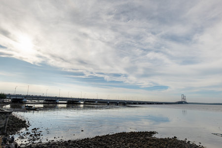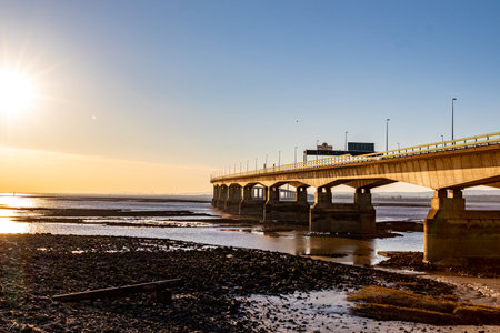Second Severn crossing, a bridge linking Bristol to Wales. Panoramic view at sunset with low tide on the river. Travel and nature concepts