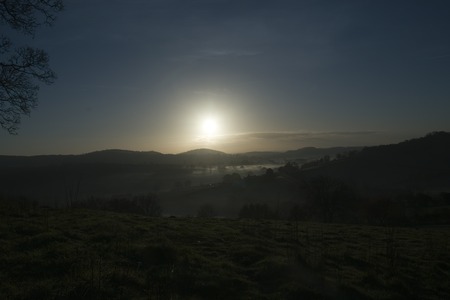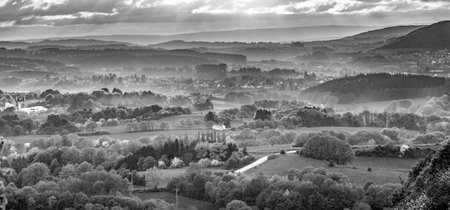 Cool Autumn sunrise over the hills and fields with early morning mist in the valleys in the Herefordshire countryside, England