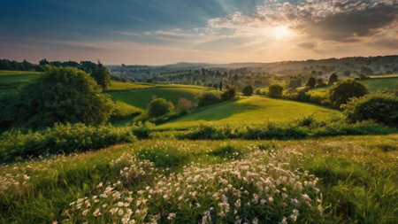 Panoramic view of green fields and meadows at sunset.