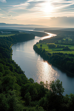 Panoramic view of a river in the countryside at sunset.