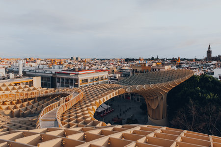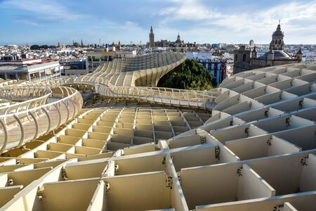 Seville, Spain - January 19, 2020: View of Seville skyline and Metropol Parasol, the largest wooden structure in the world, in La Encarnacion square Seville, Spain.