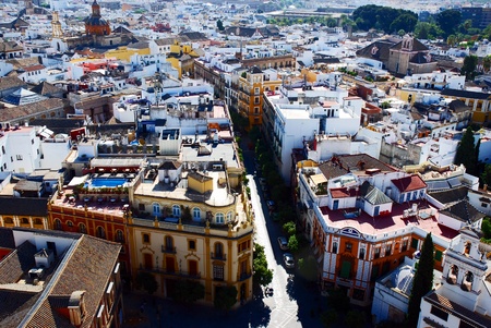 Aerial panoramic view of the old city rooftops from the Giralda Tower in Seville, Andalusia, Spain