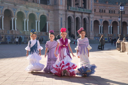Young black woman dressed as a flamenco gypsy in a famous square in Seville, Spain. She wears a beige dress with ruffles and red shawl and red fan. Flamenco cultural heritage of humanity
