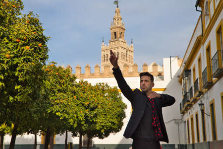 gypsy man dancing flamenco, young and handsome dressed in black is posing with one arm up among orange trees and in the background the giralda of seville. Flemish cultural heritage of humanity.