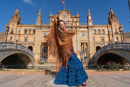 Young black woman dressed as a flamenco gypsy in a square in Seville, Spain. She wears a beige dress with ruffles and a red shawl with flowers. Flamenco cultural heritage of humanity. Dance concepts