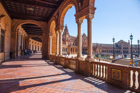 Seville, Spain - January 17, 2020: People amongst arches on Plaza de España, a plaza in the Parque de MarÃa Luisa, in Seville, Spain, built in 1928 for the Ibero-American Exposition of 1929.