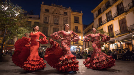 Experience the vibrant culture of Spain through the enchanting performance of three flamenco dancers in stunning red dresses at night.