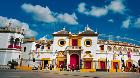 SEVILLE, SPAIN - 08 APRIL, 2019: The Plaza de toros de la Real Maestranza de Caballeria de Sevilla is bullring in Seville, Spain