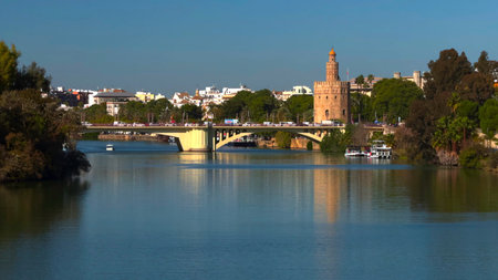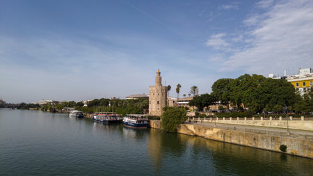 SEVILLE, SPAIN - 06 APRIL, 2019: View of Guadalkivir river and Torre del Oro, historical limestone Tower of Gold in Seville, a big tourist center in Spain