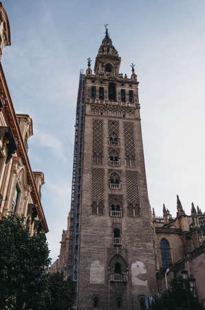 Seville, Spain - January 17, 2020: Low angle view of The Giralda, the bell tower of Seville Cathedral in Seville. The tower is one of the most important symbols of the city.
