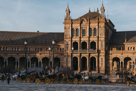 Seville, Spain - January 17, 2020: Horse-drawn carriages city tour on Plaza de España, a plaza in the Parque de MarÃa Luisa, in Seville, Spain, built in 1928 for the Ibero-American Exposition of 1929.