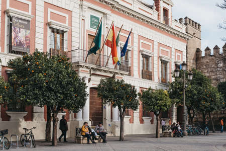 Seville, Spain - January 17, 2020: Facade of Casa de la Provincia on Plaza del Triunfo, small plaza in Seville known for its adjacent historic buildings, people sitting on benches outside.