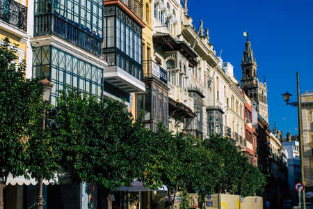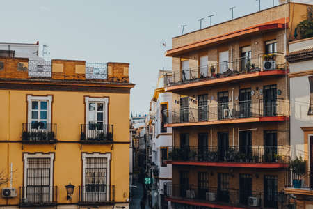 Seville, Spain - January 19, 2020: Traditional colourful buildings with balconies on a street in Seville, capital of Andalusia region in Southern Spain and a popular tourist destination.
