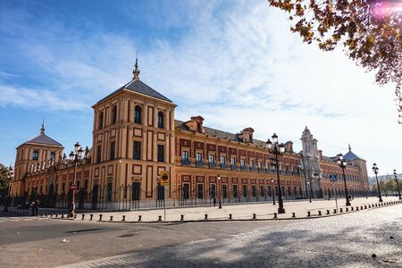 SEVILLE, SPAIN - Jul 30, 2020: Antique building view in Old Town Seville during covid-19, Spain