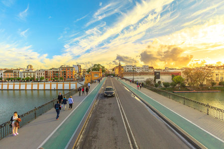 Seville, Andalusia, Spain - April 19, 2016: City Sightseeing of Seville from tourist Bus of Castle Museum of San Jorge or Castillo de San Jorge crossing Puente de Isabel II or bridge Isabel II.