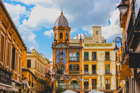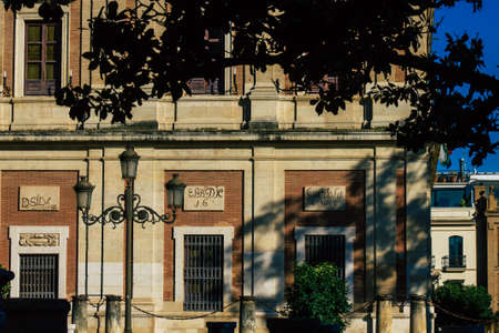 Seville Spain August 10, 2021 Facade of a building in the streets of Seville, an emblematic city and the capital of the region of Andalusia, in the south of Spain