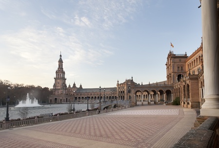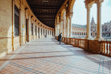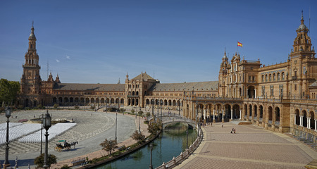Famous Plaza de Espana. Spanish square in the centre of old but magnificent Seville, Spain. Unique moorish architecture. Built in 1929, is a huge half circle with a total area of 50,000 square meters