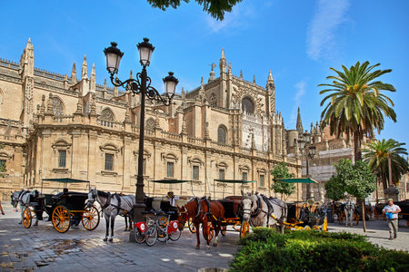 Seville, Spain - January 19,2020: Horse carriage waiting for tourists on Plaza del Triunfo, small plaza and popular meeting spot in Seville known for its tall monument and adjacent historic buildings.