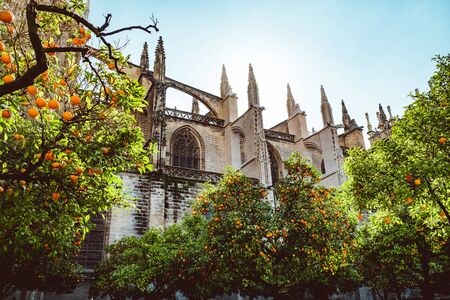 Spain, Andalusia, Seville, the Cathedral bell tower seen from the orange tree courtyard. 2019 February