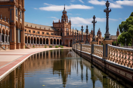 Historic architecture and canal reflection at plaza de Espana in seville. Spain Square, Plaza de Espana