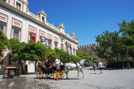 Horse drawn carriages in Plaza Virgen de los Reyes and Archbishop's Palace of Seville (Palacio Arzobispal) and Alcazar, Sevilla, Spain