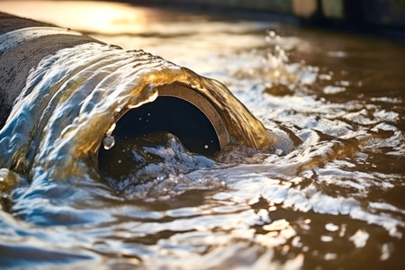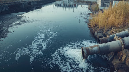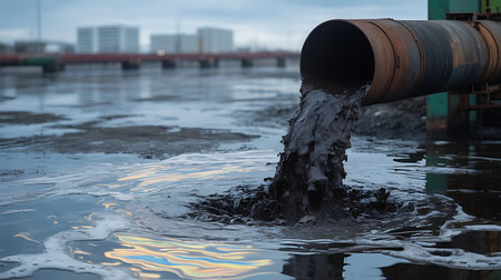 Dirty wastewater pouring from an industrial pipe into a river, representing pollution and environmental harm, with a focus on the murky water