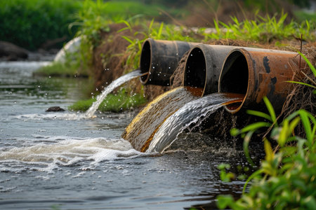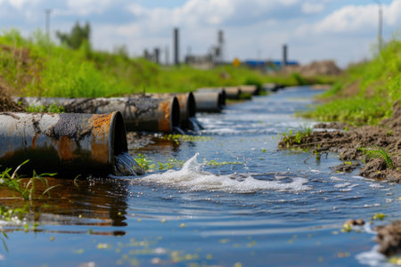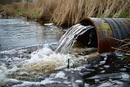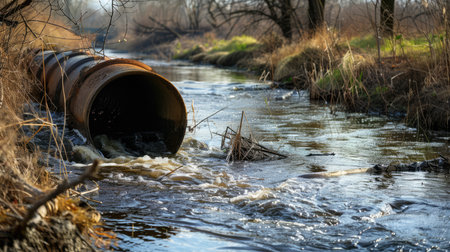 Polluted water effluents gush from an industrial pipe, disturbing the tranquility of a natural river environment.