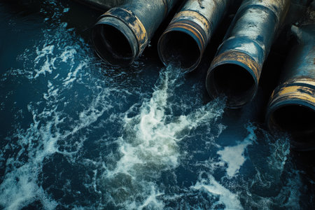 This image captures a rusty pipe discharging water into dark ocean waves, surrounded by foam and bubbles. It highlights the impact of industrial waste on marine environments.