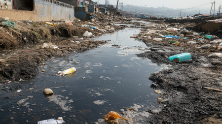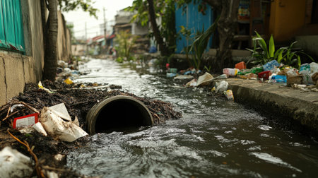 The image depicts a polluted waterway in an urban neighborhood, showcasing plastic waste and debris that highlight environmental issues and sanitation challenges.