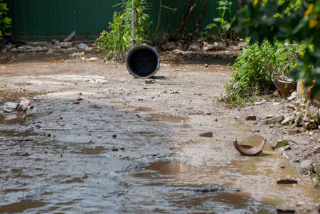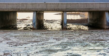 Visual composition of sewage pollution contaminated water flowing from a pipe with impurities