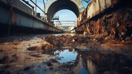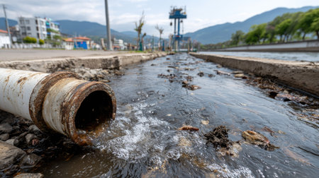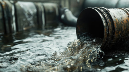 Dirty water flowing from sewer pipes in a gritty 3D scene