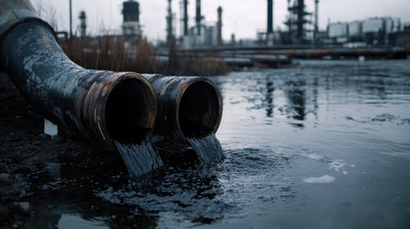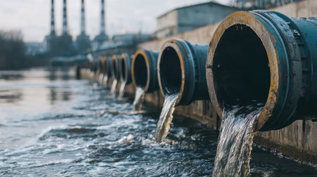Large industrial pipes discharging dark liquid into a river, with factory chimneys in the background.