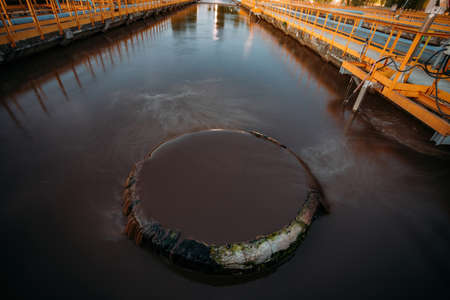 Industrial wastewater and urban sewage flowing through round sewer pipe.