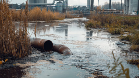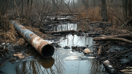 This image captures the unsettling beauty of pollution in a wetland area, featuring a rusty pipe and stagnant water amidst dying vegetation, evoking a sense of tranquility amid decay.