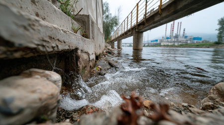 A serene view capturing a water stream flowing beside a concrete structure with an industrial facility in the background, emphasizing nature