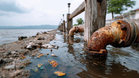 This image depicts a rusty pipe discharging waste into polluted waters, surrounded by debris on the shoreline. It highlights environmental concerns.